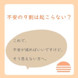 不安の9割は起こらない。でも、安心できない方へ「不安の対処法」について、簡単に書かせて頂きました。まずは、不安とは、なぜ起こるかと言うと、その1つに…